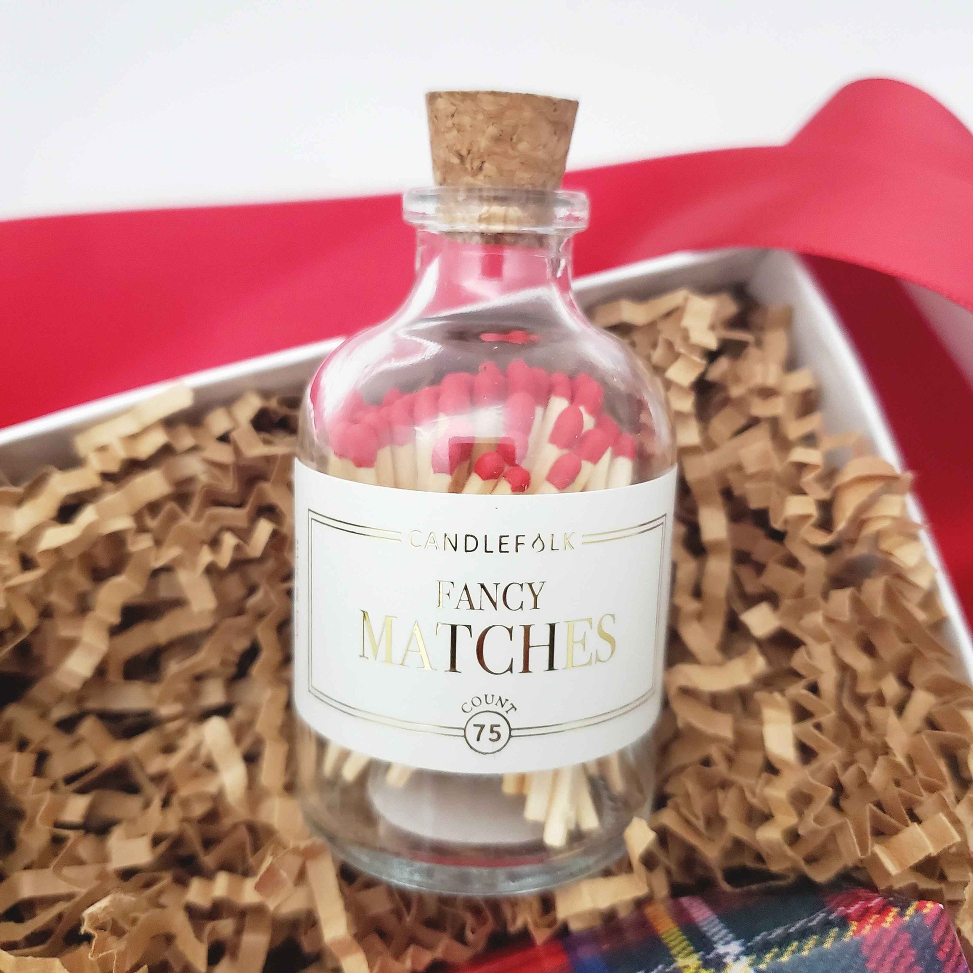 - Apothecary Matches - Red tip matches in a apothecary-inspired glass bottle with a cork top and a striker on the bottom.