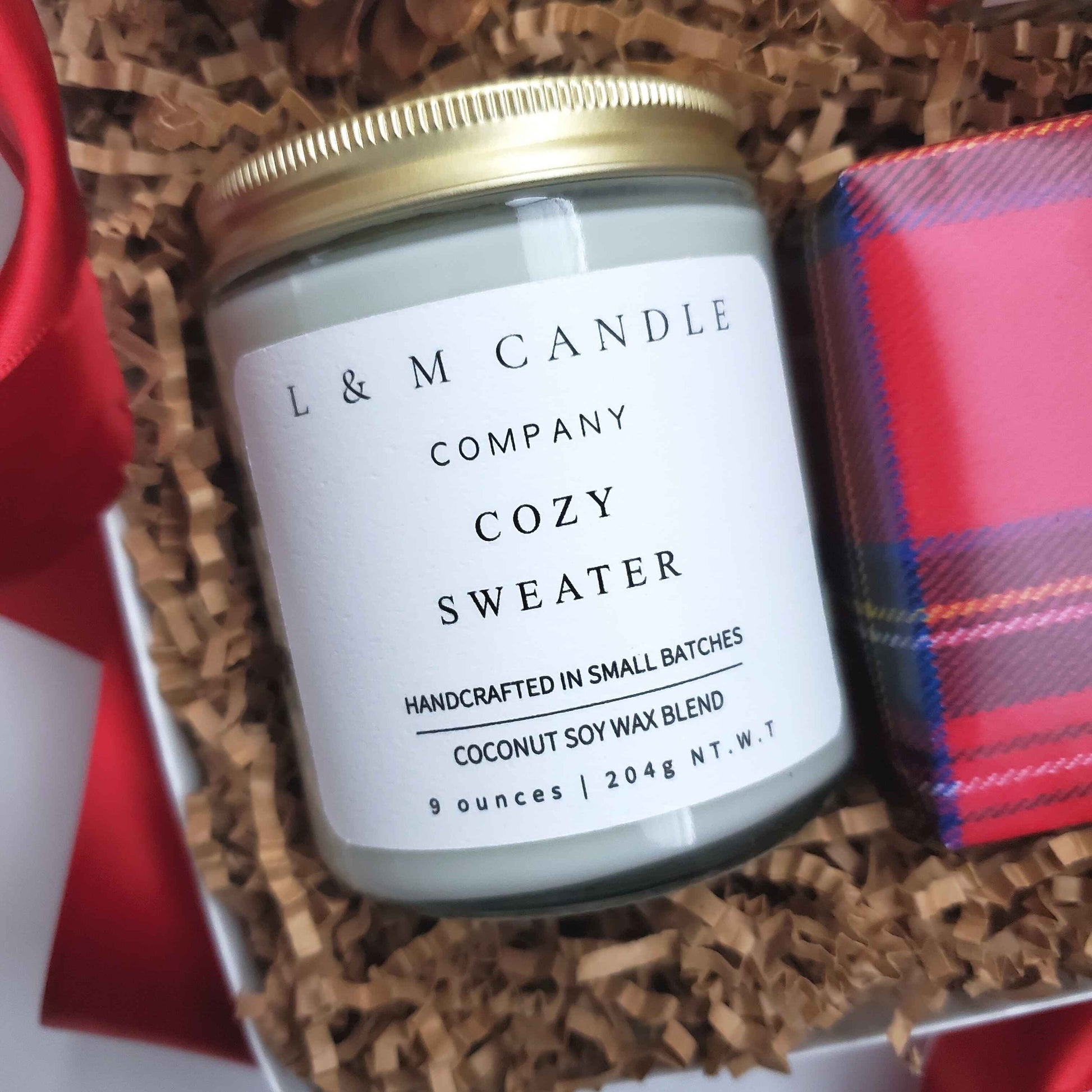 - Cozy Sweater Candle- a beautiful Fall and Winter candle with notes of mint that intertwine with subtle undertones of green apples and peaches on a base of musk and oak moss. Hand-poured in small batches.
