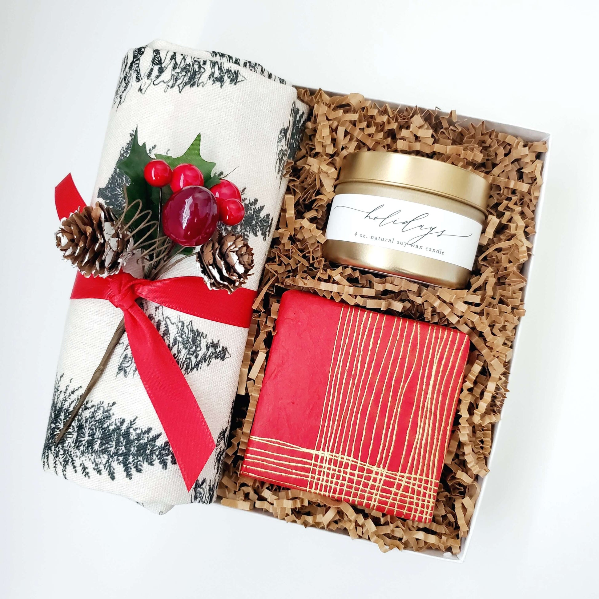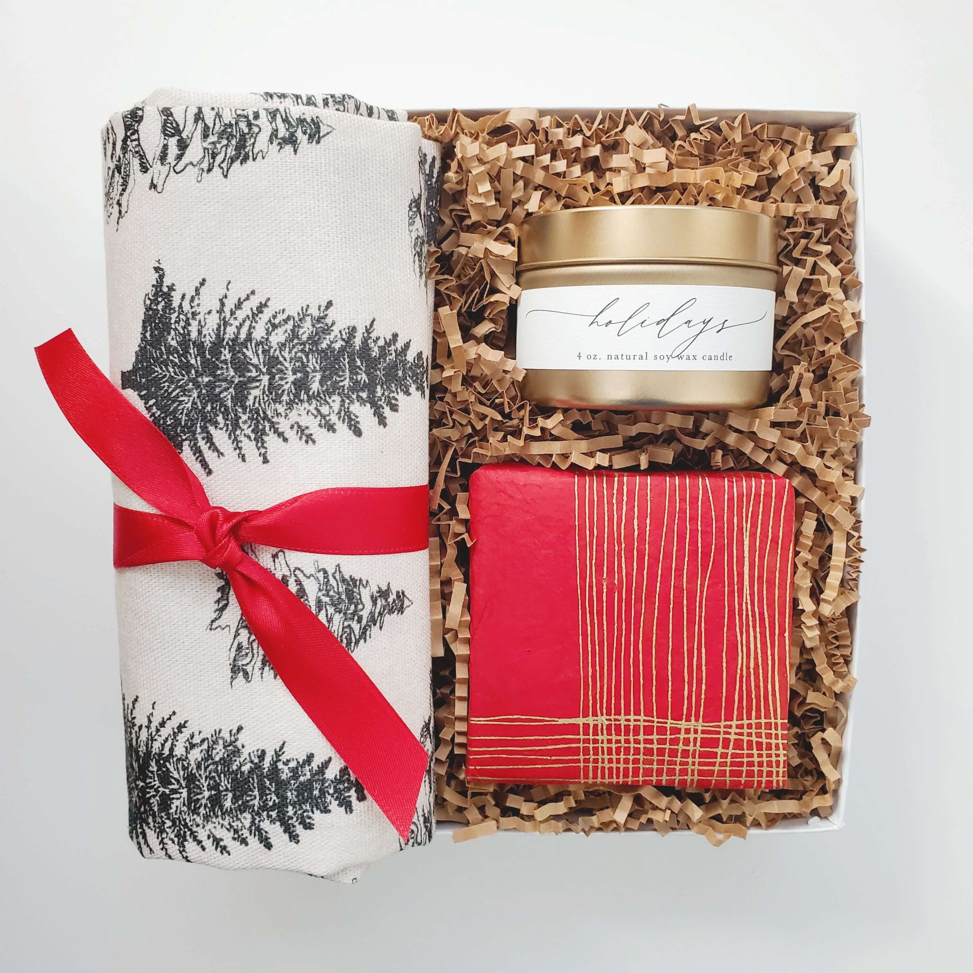 This gift is all about the Holiday season with a holiday candle whose scent will bring back Christmas memories and nostalgia. Also includes a beautiful handmade flour sack towel for all the holiday baking and a sweet treat of handcrafted sea salt caramels.
